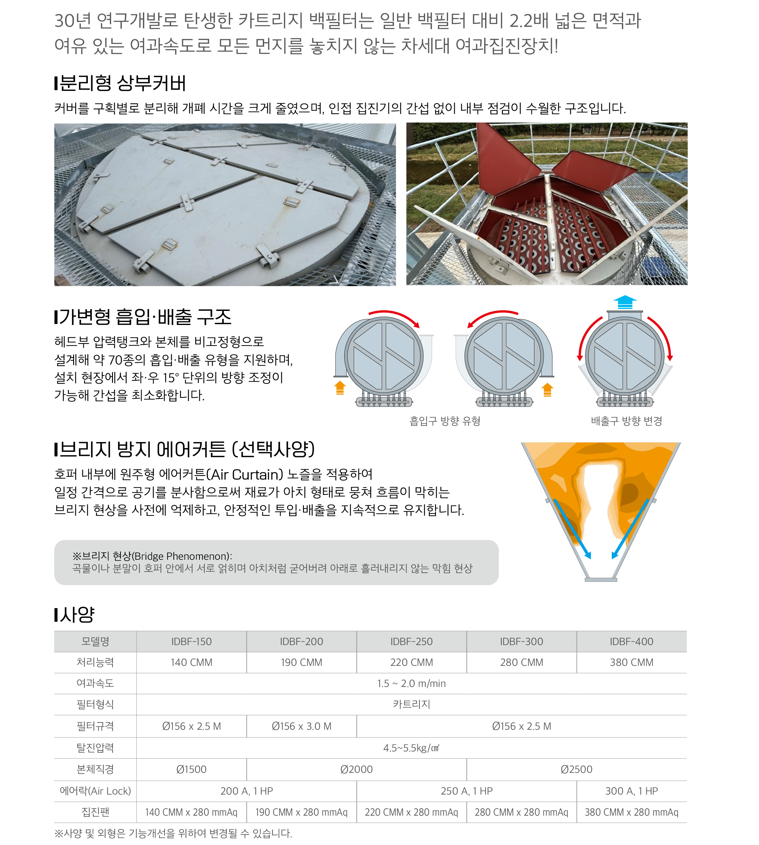 · 일반 백필터 대비 2.2배 넓은 여과면적의 카트리지 백필터 적용으로 집진 효율 향상 · 분리형 상부 커버 구조로 신속하고 편리한 내부 점검 · 가변형 흡입·배출 구조로 다양한 현장에 유연한 설치 대응 · 브리지 방지 에어커튼 적용 가능 (선택사양)